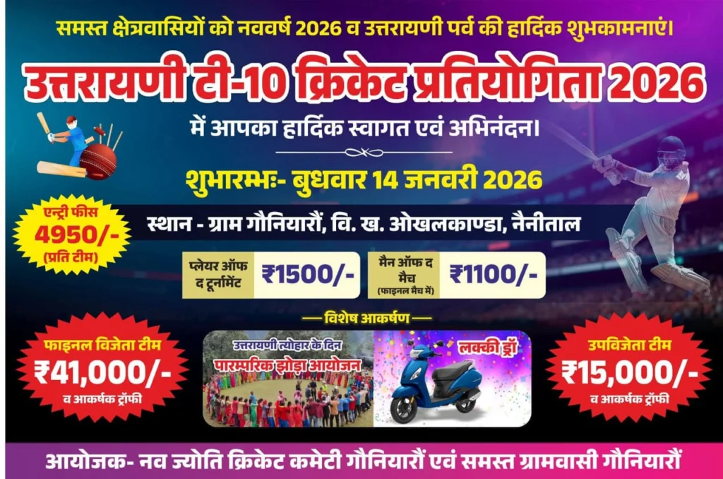 उत्तरायणी के पावन पर्व पर ओखलकांडा ब्लॉक के गौनियारौ गाँव में खेल प्रेमियों के लिए उत्साह और रोमांच अपने चरम पर होगा। नवज्योति क्रिकेट क्लब के तत्वावधान में ब्लॉक के सबसे बड़े ‘उत्तरायणी टी-10 क्रिकेट टूर्नामेंट’ का आयोजन किया जा रहा है, जिसका विधिवत शुभारंभ 14 जनवरी को रंगारंग सांस्कृतिक कार्यक्रमों के साथ किया जाएगा।