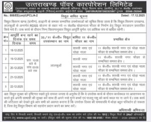 22 दिसंबर 2025 तक विद्युत आपूर्ति बाधित रहने की सूचना सार्वजनिक की गई है। विद्युत वितरण खंड, हल्द्वानी ग्रामीण की ओर से जारी विज्ञप्ति के अनुसार यह विद्युत कटौती 18 दिसंबर से 22 दिसंबर 2025 तक विभिन्न तिथियों में निर्धारित रोस्टर के तहत की जाएगी।